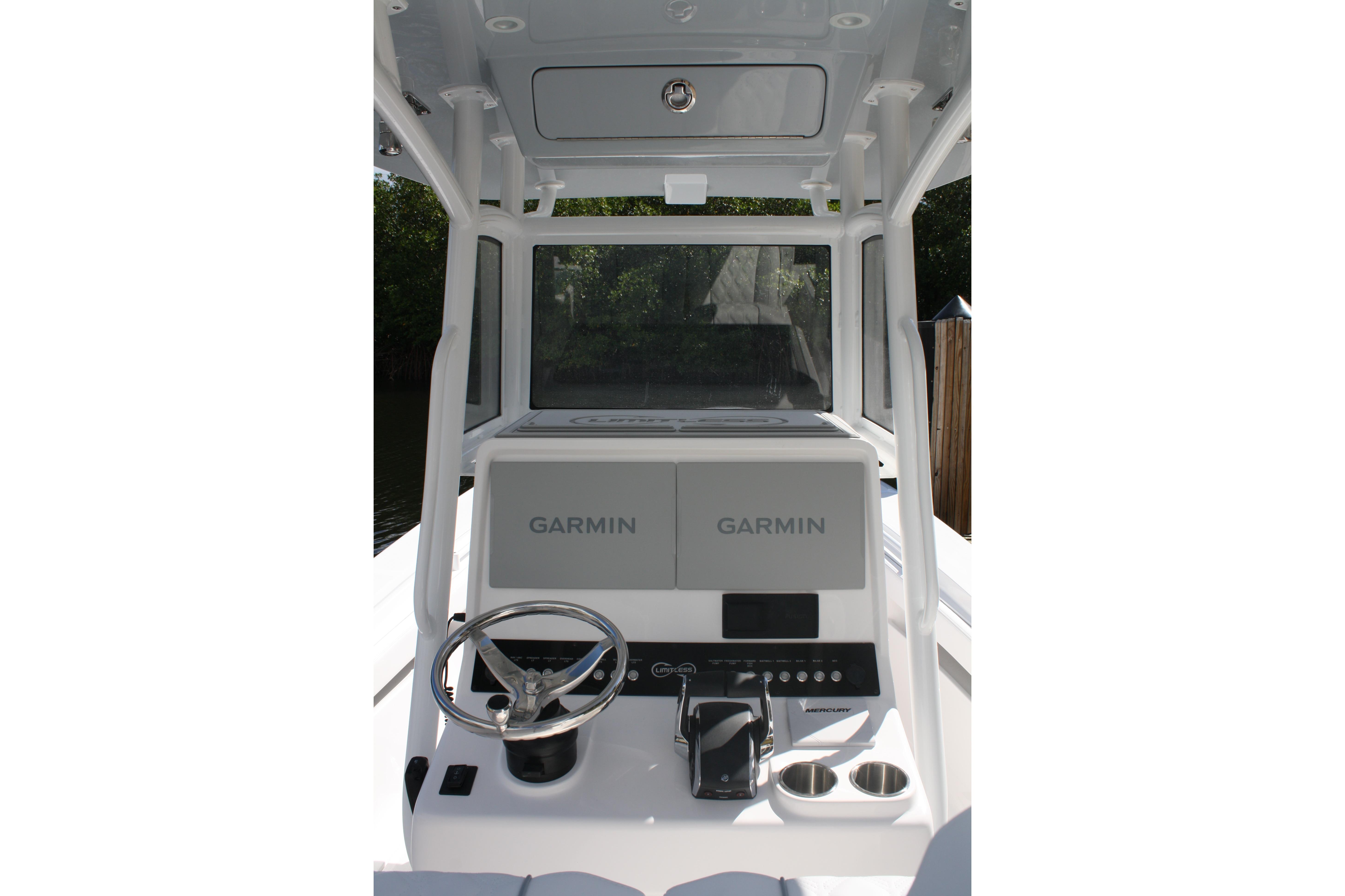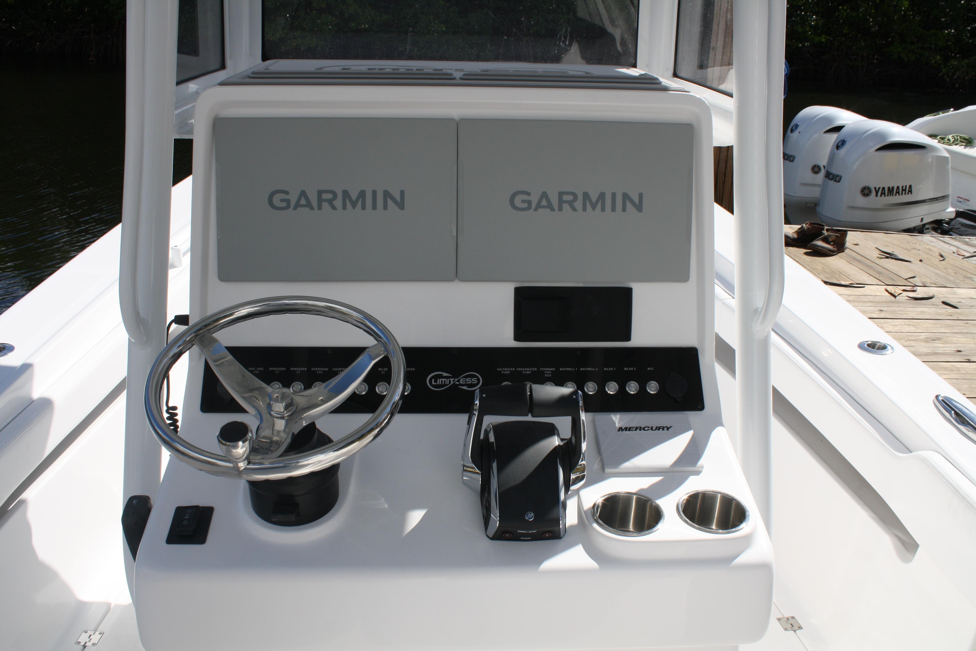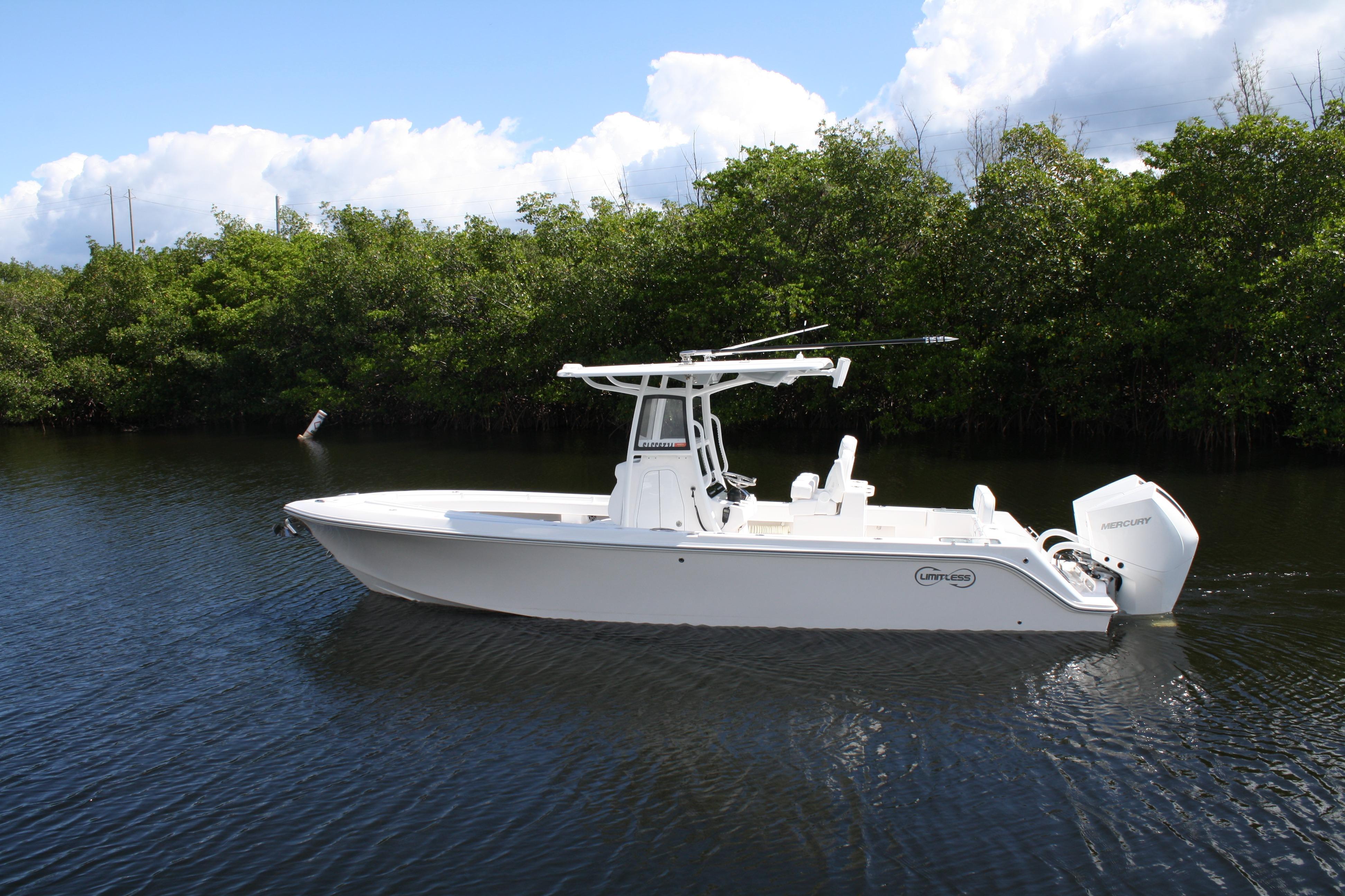 2026 Limitless Center Console 270 Fully Equipped, perfect for Fishing and/or Cruising. Powered with Twin 250 HP Mercury 4-Stroke V8 4.6 Liters Cold Fusion White Paint. Dual Pump Seachest with twin aquarium Baitwells. Electric Windlass. Molded Fiberglass Forward Seating with backrests. Captain Chairs/Bolsters. Hard Top with powder Coated white Structure. Seakeeper Rider Trim Tabs System. Rear Bench Seat. Gemlux 18 Feet Carbon Fiber Outriggers. Lumitec Lighting throughout. Underwater Lights. Full Garmin Electronic Package and Fusion/JL Audio equipment.